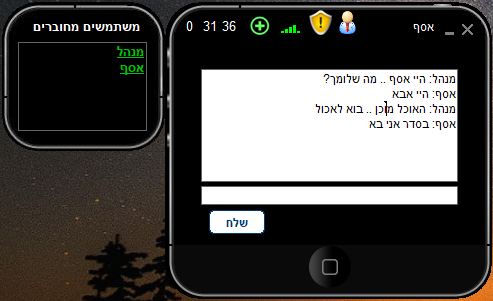 במסך הצ'אט זה כל המשתמשים המחוברים למערכת בתוך הרשת הביתית יכולים לשוחח בניהם ולדבר עם כולם בצורה חופשית. כל התכתבות אשר מופיעה פה יהיה ניתן לראות אותה גם בבקרת ההורים בחלונית "בקרה - צ'אט". גם מנהל מערכת יכול להתכתב עם כל הילדים המחוברים למערכת בלחיצה אחת. מצד שמאל מוצגים לנו בחלון נפרד את כל המשתמשים המחוברים כעת למערכת בתוך הבית. בדוגמה הנל מנהל המערכת והמשתמש אסף רק הם מחוברים למערכת וניתן לדבר איתם בצ'אט. שימו לב כי תמיד בחלק העליון מוצג למשתמש את זמן המחשב שנותר לו.