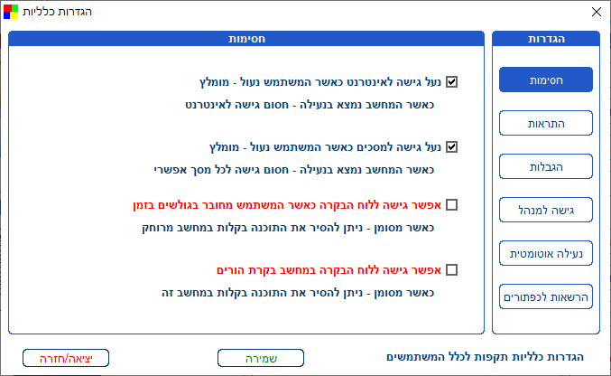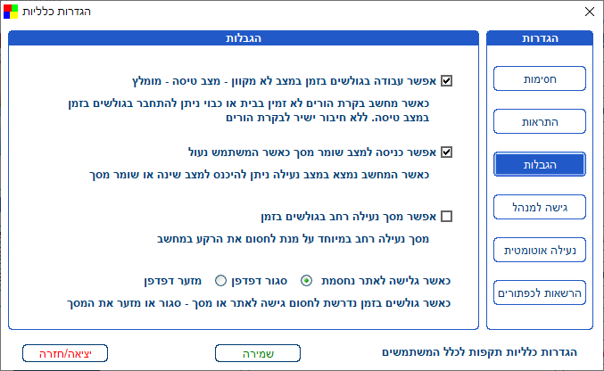 - עבודה במצב טיסה - כאשר מסומן אפשר להתחבר בגולשים בזמן גם אם מחשב בקרת הורים כבוי, לא זמין ברשת או במצב שינה.