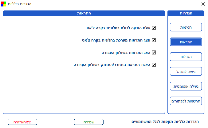 במידה שלא סומן משתמש ברשימת המשתמשים ואפשרות זו מסומנת ההודעה תשלח לכולם כברירת מחדל. - הצג התראות מערכת - כאשר מסומן יוצגו בחלונית בקרה צ'אט הודעות למנהל. למשך: משתמש שניסה לגלוש לאתר לא מורשה,