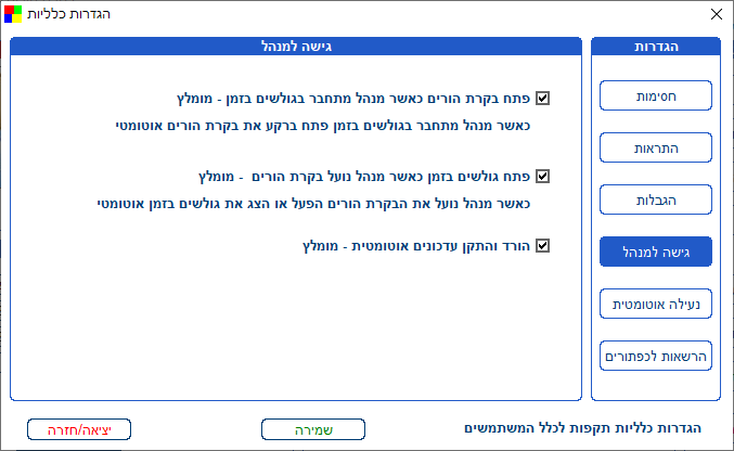 - פתח גולשים בזמן כאשר מנהל נועל בקרת הורים - כאשר מסומן ומנהל נועל את בקרת הורים, ייפתח מסך גולשים בזמן.