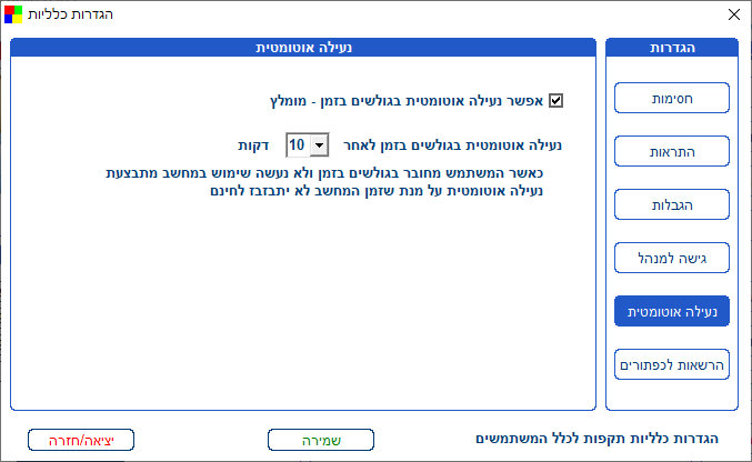 - נעילה אוטמטית - כאשר מסומן והילד/משתמש מחובר בגולשים בזמן יותר מ X דקות ללא שימוש במחשב או ללא תזוזה בעכבר תתבצע נעילה אוטמטית והזמן שאבד כביכול לילד יוחזר לו למכסת הדקות שלו.