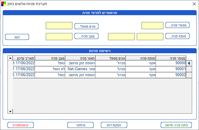 במסך זה ניתן לצפות בכול הפניות שנפתחו במערכת. ניתן לסנן פניות בחלונית פרטי פניה. לדוגמא בצילום הנ"ל בקשנו את כול הפניות שנפתחו ע"י המשתמש אסף.