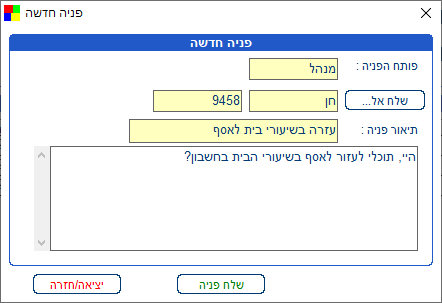במסך זה ניתן לפתוח פניה חדשה לכול משתמש המוגדר במערכת. אם המשתמש אליו נשלחה הפניה כרגע מחובר , הוא יקבל התרעה על כך באופן מיידי, אם המשתמש לא מחובר ההתרעה תתקבל ברגע שהוא יתחבר.