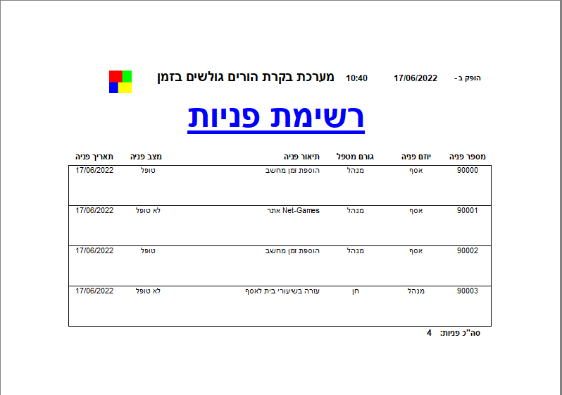 לחיצה על כפתור "הפקת דוח", תפיק דוח מובנה של רשימת פניות. אל הדוח יכתבו כול הפניות המוצגים שמתאימים לערכים שנבחרו. ניתן להדפיס את הדוח למדפסת המקומית המוגדרת אצלכם בבית ע"י לחיצה על הדפס.