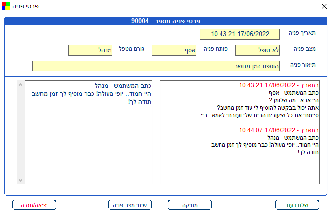 לחיצה על כפתור אחזור במסך הראשי, או לחיצה על אחת השורות בחלונית פירוט פניות יפתח המסך הנ"ל ובו יוצג השתלשלות כול ההתכתבויות שנעשו בפניה הזו.